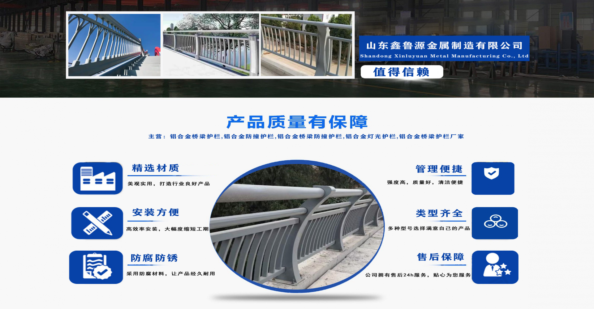 山东鑫鲁源金属制造有限公司主要经营:铝合金桥梁护栏,铝合金防撞护栏,铝合金桥梁防撞护栏,铝合金灯光护栏,不铝合金桥梁护栏厂家,环波梁桥梁护栏,环波梁防撞护栏。质量可靠、经济实用的显著特点。公司为客户提供可靠售后保障,坚持“以品质立足、服务求发展”,愿与各界朋友精诚合作、携手发展! 服务优势:真诚的服务理念、完善的服务体系。公司专业力量充足;工程案例众多、从业经验丰富;公司以可靠质量的产品,合理的价格,完善的售后服务,能够满足市场各个企业的需求?! ∑笠稻?执着追求 持续创新执着追求,就是坚持不懈、坚定从容,专注于自己的事业,把能做的事情做好,不断克服困难、把握机遇,赢得未来?! 〕中葱?,就是生命不息、创新不止,通过持续实施技术创新、管理创新、市场创新,获取持续的竞争优势。...